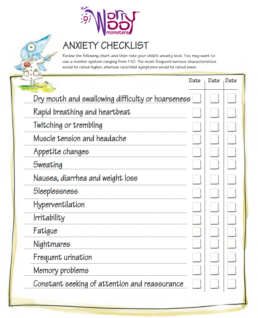 Use the checklist to rate and keep track of your child’s anxiety level of a period of time. You may want to use a number system ranging from 1-10. The most frequent/serious characteristics would be rated higher, whereas rare/mild symptoms would be rated lower.